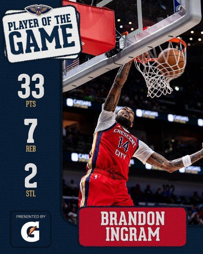 鹈鹕(1-0):英格拉姆33分7篮板、麦科勒姆23分5助攻、穆雷14分8篮板10助攻、霍金斯13分7篮板、米西12分7篮板